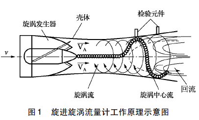 當流體通過螺旋形的旋渦發生體后,流體被迫繞旋渦發生體中心劇烈地旋轉,形成旋渦流。旋渦流加速,沿流動方向經縮段、流動強度增強。當旋渦流進入擴散段后,在導流體回流的作用下,該旋渦產生二次旋轉,二次旋渦的頻率與流量與正比。當流量計設計得當時,在很寬的流量范圍內,旋渦頻率與流量成線性關系。該頻率由壓電傳感器檢測,通過流量積算儀進行運算和處理。顯示流量的瞬間流量和累積總量,并變送輸出對應的4-20mA電流信號。